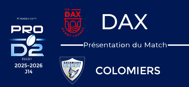 Vendredi 12 décembre 2025, dès 19h30, Colomiers vient à Dax pour le compte de la 14ième journée de ProD2. Toujours fixé aux 4 premières places depuis le début de la saison, actuellement 3ième du classement, Colomiers totalise 42 points (le double de Dax), 9 victoires (dont 4/6 obtenues chez des adversaires mal classés : Mt2, Angoulême, Carcassonne, Béziers), 4 défaites (dont 1 à domicile contre Provence), 5 bonus (dont 3 offensifs à Biarritz 44/10, contre Aurillac 38/13 et Grenoble il y a 8 jours 43/7).