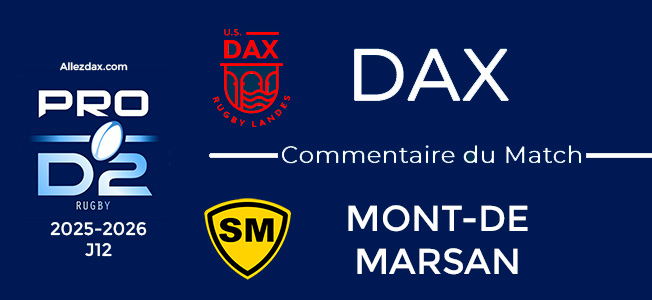 C'est le rendez-vous que tout le rugby du Sud-Ouest attend car cette rivalité rugbystique très sympathique mais aussi bien réelle est une histoire toujours passionnante entre ces deux Clubs rivaux certes mais qui aiment se retrouver afin de partager des moments festifs sans pour autant en oublier la suprématie de l'Ovalie Landaise. On note à DAX le retour dans l'équipe de Ratu NACIKA et de Sam WASLEY, deux joueurs explosifs, qui avaient hâte de rechausser les crampons. Les supporters venus en nombre, ils sont 8269 ce soir, ne se sont pas trompés ils verront une équipe Dacquoise dominante dans tous les secteurs de jeu faisant cavalier seul avec pléthore d'essais (10 au total ) qui ont fait chavirer un stade Maurice Boyau à l'unisson, nul doute que les Montois ont sûrement beaucoup moins apprécié cette efficacité du rugby local ...