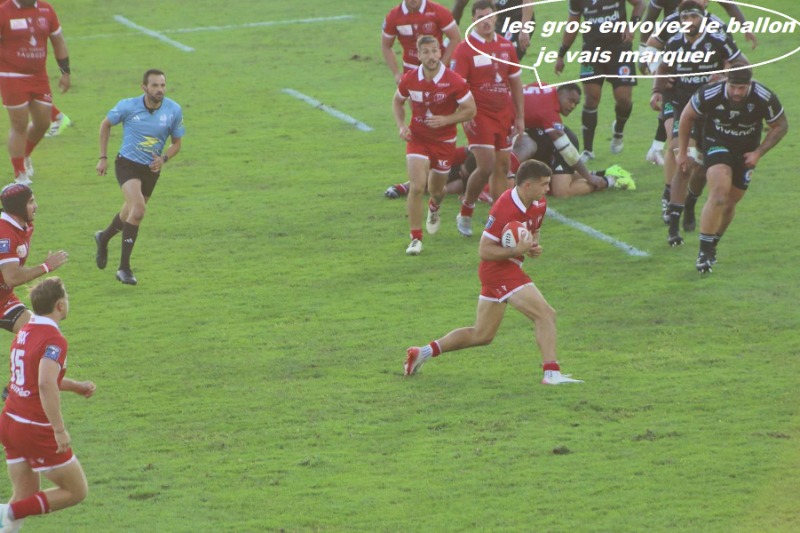 Un fait de jeu montre bien notre impuissance à avancer c'est J.B Barrère qui dans la ligne des 3/4 est obligé de jouer au pied pour que l'on occupe le camp de l'adversaire c'est dire l'impuissance de nos 3/4 (... hormis Ben ALLA qui fait son match et marque son essai)