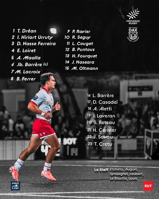Equipe rajeunie aussi pour Provence. Des absents et des blessés certes, mais remise en question pour le groupe. Provence s'attend à une équipe dacquoise joueuse. La consigne est de garder la possession au max et de marquer rapidement pour ne pas se mettre le doute en tête.