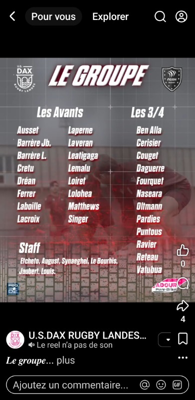 A part Sovau et l'ailier fidjien (pitié ne me demande pas son nom), effectif complet. Singer, Guillaume , Nacika et Naceara s'entraînent avec le groupe, ainsi que Manukula et pas mal d'espoir donc : Dourthe et Lacroix en particulier. Aletti en civil .