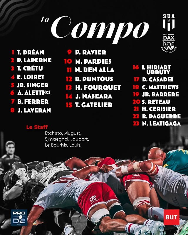 Arnaud Aletti et Iban Hiriart-Urruty retrouvent le groupe après une courte absence. Mathys Pardies, Thomas Cretu et Julien Laveran vivront leur première titularisation. Louis Couget, sorti sur civière vendredi dernier, est au repos. Ne postulent pas encore Théo Duprat (genou), Romuald Seguy (main), Sam Wasley (cheville), Lucas Guillaume (cuisse), Alexandre Manukula (genou) et Diogo Hasse Ferreira (cuisse), mais certains, dont l’arrière, sont en phase de reprise. Maxime Oltmann (cheville) a dû lui aussi passer aux soins cette semaine.