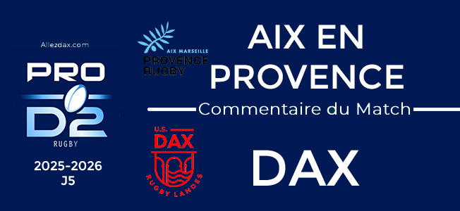 Début de match dominé par la puissance des avants aixois qui inscrivent 2 essais sur ballon porté. Ensuite le jeu s’équilibre, les dacquois enchainent des temps de jeu sans concrétiser. Ils finissent par marquer un essai sous les poteaux après une action bien construite. Les buteurs se chargent de meubler le planchot avec des pénalités. 18 à 10 à la mi-temps sifflée sur une pénalité manquée par le buteur dacquois.