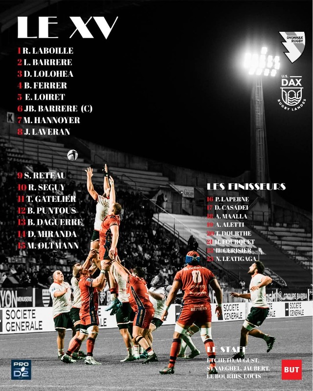 De notre côté, nous alignons une équipe hybride avec quelques titulaires indiscutables sur la feuille (Lolohéa, JB Barrère, Reteau, Séguy, Daguerre...) mais aussi une seconde ligne "très faible" (Ferrer-Loiret-Maala) et de la jeunesse dans toutes les lignes (Laboille, Maala, Hannoyer, Laveran, Sovau...).