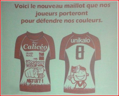 ben disont que c'est cette photo qui a été choisie pour illustrer l'article de sud ouest du jour avec interview de Ponteins. Car sur le site de sud ouest des mercredi soir il y avait 3 photos de la réunion dont 2 photos du maillot( celle que kékito a mis sur le site et celle qui apparait aujourdhui sur le journal).Rien de bizarre en fait.Je trouve bizarre que le président de l'usd et de calicéo ne présente (voir sud ouest de ce jour) que le dos du maillot (sponsor unicalo) .Faut il y voir un recul, et que la face ou apparait justement calicéo soit repensé redessiné . Je l'espère