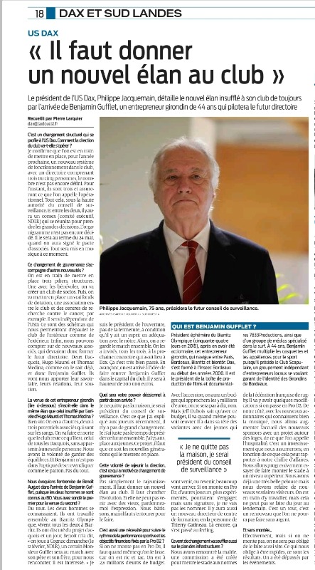 Le président de l’US Dax, Philippe Jacquemain, détaille le nouvel élan insufflé à son club de toujours par l’arrivée de Benjamin Gufflet, un entrepreneur girondin de 44 ans qui pilotera le futur directoire