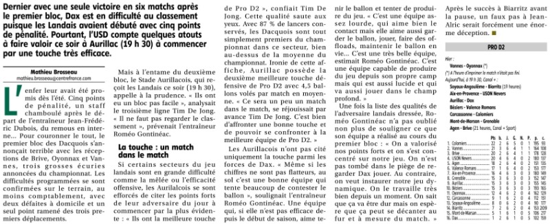 Article sur le match de ce soir dans La Montagne. Où l'on apprend notamment que l'USD est la 1ère équipe de ce début de saison dans le secteur de la touche... Aurillac va nous prendre très au sérieux, il va falloir être au niveau !