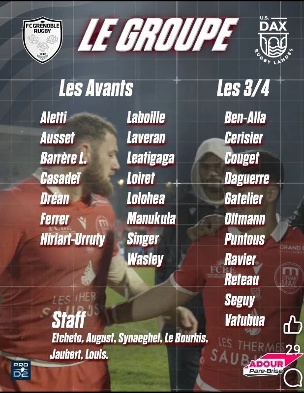 Jusqu'alors, l'équipe a fait le "taf", Etcheto est ambitieux et enverra un groupe en capacité de s'imposer en Isère. Malgré tout, j'imagine encore un large turn-over (subi ou choisi) pur cette rencontre.