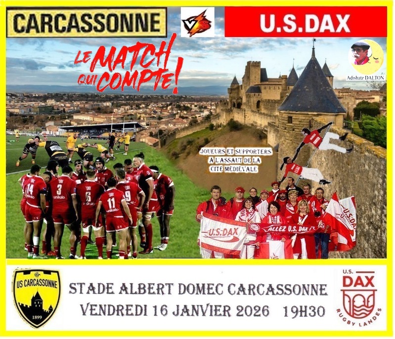 Un match qui va compter double entre deux équipes qui vont lutter pour la survie en ProD2 , l'équipe de Carcassonne n'avait pas présenté à Oyonnax ses joueurs majeurs pour les ménager, ils seront présents face à Dax, c'est dire l'importance majuscule qu'ils accordent à cette rencontre ... qu'ils ne veulent pas perdre !