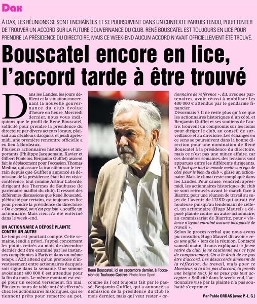 Plus rien ne va dans ce club. Il faut que la personne qui a giflé Maurel parte, il n’y a pas d’autres alternatives, et qu’il amène avec lui tous les septiques toutes ces personnes qui n’existent qu’à travers l Usdax. Je ne parle pas de mrs Jacquemin Ponteins Medina . Il faut du concret très vite pour sauver nos couleurs . On ne va pas avaler des noix de cocos toutes la journée.