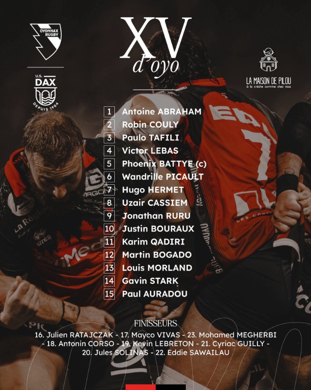 Pour ce long déplacement à OYONNAX il y aura une équipe Dacquoise certes remaniée et rajeunie mais c'est aussi une opportunité offerte aux joueurs qui seront sur le pré de se mettre en évidence, l' avenir de certains se joue maintenant !