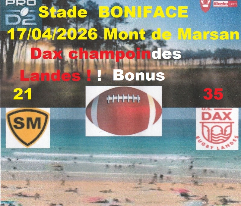 Champion du monde des Landes et Champion Côte Basque Landes ! Bravo à l'équipe d'avoir été se peler ce match à Boniface sous un soleil printanier, plus de 11 000 personnes et rentrer sur les bords de la Fontaine Chaude avec 5 points en plus ! La fête va être belle sur les bords de l'Adour !
